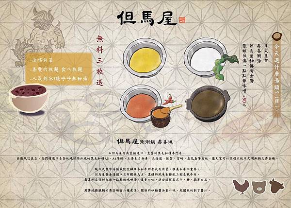 日式昆布、壽喜涮湯、但馬屋秘傳黃金湯、張姐祖傳一點點辣味增湯(+50元)